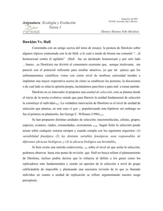 El documento discute las posturas de Dawkins y Hull sobre la unidad de selección en la teoría evolutiva. Aunque Dawkins propuso al gen como la unidad de selección, este concepto ya había sido planteado antes. Hull también ve al gen como el replicador fundamental y se opone a la selección a nivel de grupo. Ambos autores difieren en su definición de "interactor", la entidad que interactúa con el medio ambiente para producir replicación diferencial. El documento analiza estas diferencias sin concluir que una postura refute a la otra.