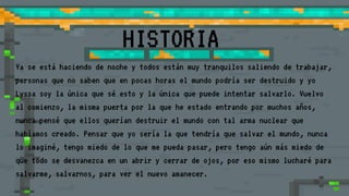 La historia trata sobre Lyssa, una científica que descubre que sus compañeros planean destruir el mundo con un arma nuclear. Lyssa es la única que sabe esto y debe intentar detenerlos para salvar al mundo. El documento presenta a Lyssa como la protagonista y describe sus habilidades, movimientos, muertes posibles y los obstáculos y enemigos a los que se enfrentará en su misión para evitar que el mundo sea destruido.