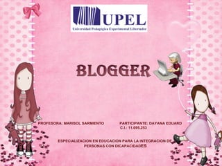 El documento habla sobre la especialización en educación para la integración de personas con discapacidades. Detalla los elementos clave de la especialización como publicar contenido, compartir información actualizada, y organizar estrategias mediante una bitácora en línea para ordenar la información de manera individual, grupal y cronológica.