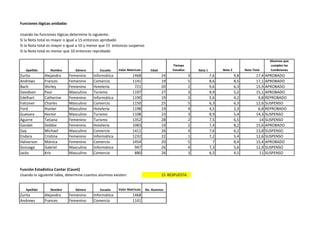 Este documento presenta información sobre 15 estudiantes, incluyendo sus notas y resultados académicos. Usa funciones lógicas y estadísticas de Excel para analizar los datos. Determina cuántos estudiantes aprobaron, reprobaron o tuvieron suspensión basado en sus notas totales, y calcula estadísticas como promedio, desviación estándar, valor máximo y mínimo, mediana y moda.