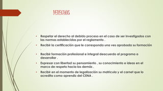 Los derechos del estudiante incluyen recibir un debido proceso si es investigado, recibir una certificación una vez aprobada su formación, y recibir una formación profesional e integral según el programa. Los deberes del estudiante son cumplir con todas las actividades del SENA, respetar a los demás estudiantes y el centro de formación, y respetar los bienes ajenos y el reglamento del SENA.