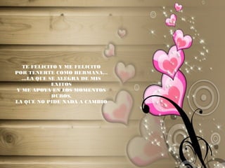 Este mensaje de cumpleaños celebra la relación especial entre dos hermanas, destacando el apoyo y comprensión mutuos que se brindan sin importar las circunstancias. La autora expresa su aprecio por tener a su hermana, quien se alegra de sus éxitos y la apoya en momentos difíciles sin pedir nada a cambio. Le desea a su hermana un feliz cumpleaños a pesar de la distancia física y le recuerda que siempre podrá contar con ella sin necesidad de palabras.