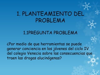 Este documento plantea la pregunta de cómo generar conciencia en los jóvenes del colegio Venecia sobre las consecuencias de las drogas alucinógenas. Justifica que los jóvenes son más propensos al consumo de drogas y que las drogas alucinógenas como la marihuana y la cocaína son las más consumidas. Describe que el problema se genera en el entorno social y que la drogadicción afecta la salud, las relaciones sociales y el estado de ánimo. El objetivo general es desarrollar herramientas