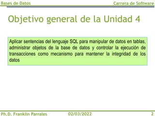 El documento es un material docente sobre bases de datos, enfocado en el uso del lenguaje SQL para manipulación y administración de datos. Cubre varios temas clave como el lenguaje de definición de datos (DDL), lenguaje de manipulación de datos (DML), control de datos (DCL) y control de transacciones (TCL), junto con ejemplos prácticos de creación, modificación y eliminación de tablas. Además, se abordan las propiedades ACID y la implementación de diagramas entidad-relación en SQL.