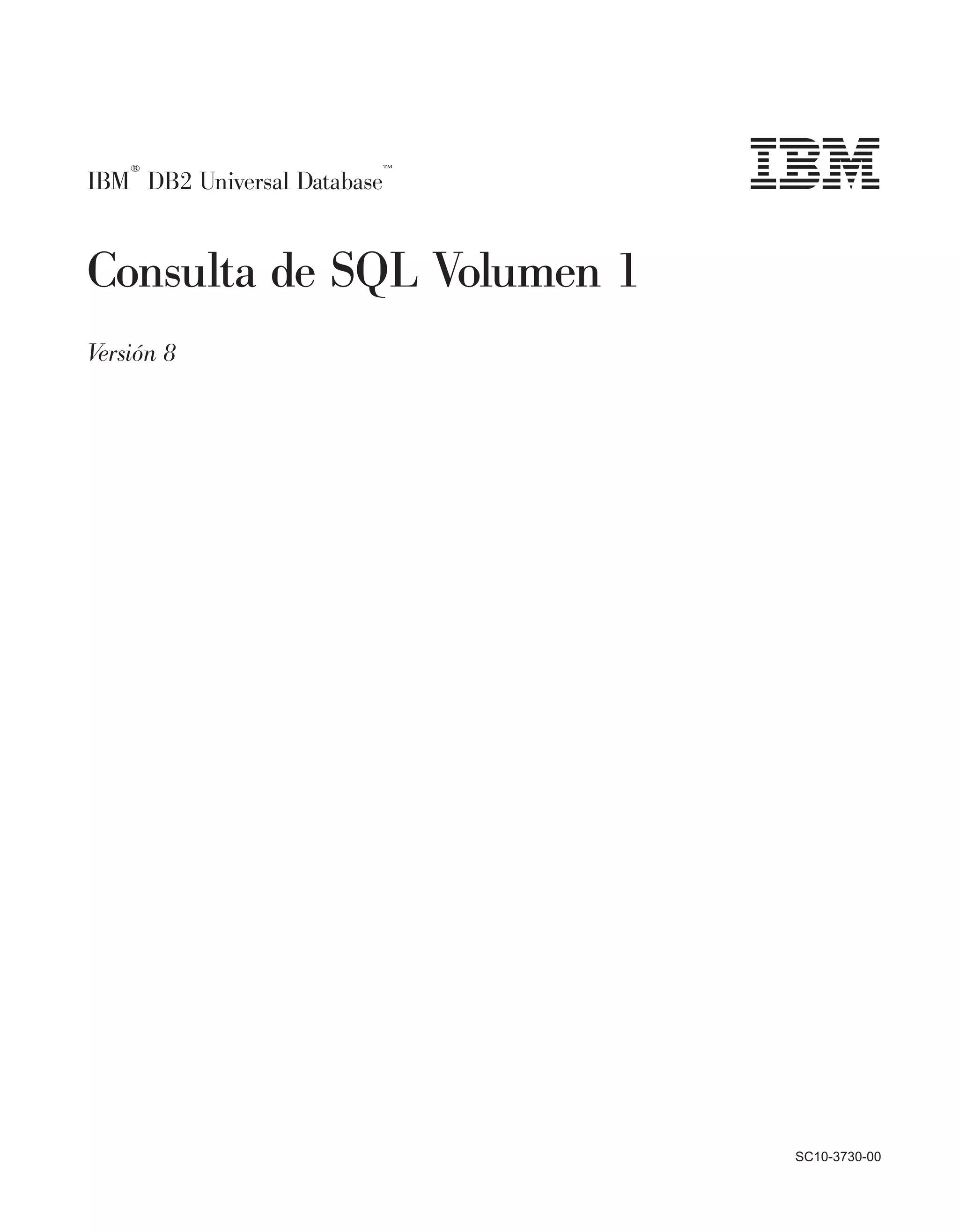 Este documento proporciona información sobre la versión 8 de IBM DB2 Universal Database SQL Reference Volume 1. Cubre conceptos clave de bases de datos relacionales y SQL, incluyendo tablas, vistas, índices, autorización, tipos de datos y expresiones.