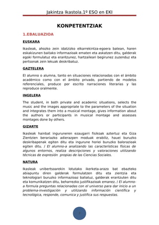 Este documento presenta las competencias evaluadas en diferentes asignaturas para estudiantes de primer año de la escuela secundaria EKI. Describe las competencias en las áreas de euskera, castellano, inglés, ciencias sociales, ciencia, matemáticas, tecnología, educación física, música, francés y proyectos. Se evalúan competencias como producir textos orales y escritos, realizar investigaciones y proyectos, y desarrollar habilidades en diferentes materias.