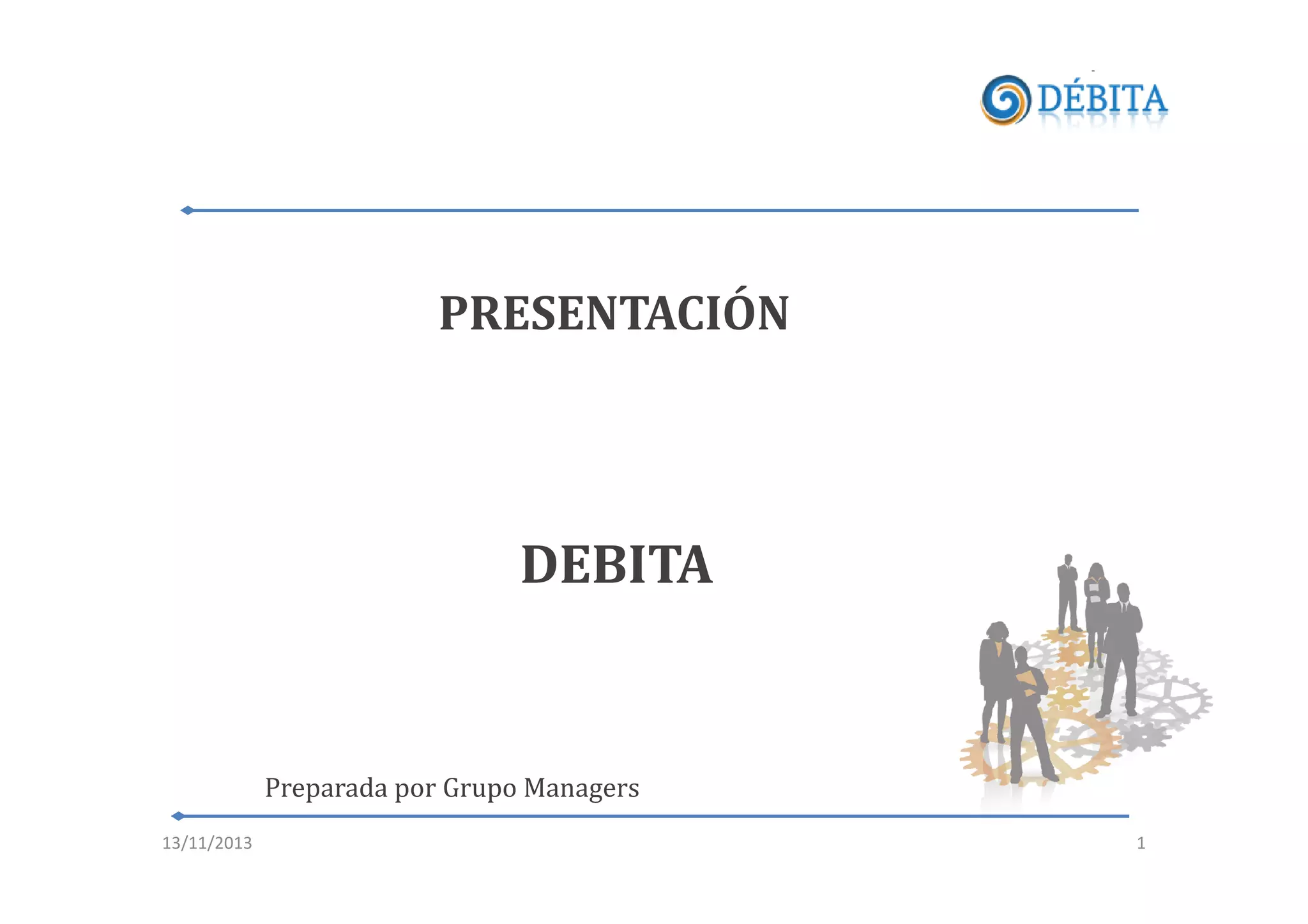 Débita es una empresa dedicada a la negociación y cobranza online de deudas morosas, utilizando una gestión amigable y tecnología avanzada para facilitar acuerdos entre acreedores y deudores. Su plataforma permite a los deudores acceder a sus deudas y promueve la reinserción en el mercado crediticio. Se dirigen a empresas con deudores morosos y operan bajo un modelo de comisión sobre el monto recuperado.