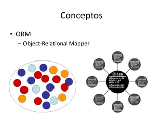 Este documento proporciona una introducción al framework ORM DBIx::Class en Perl. Explica conceptos clave como ORM, tablas, filas, clases y objetos. Define términos como ResultSets, ResultSources y Rows. Muestra cómo realizar consultas, iterar sobre resultados, encadenar consultas y realizar operaciones CRUD. También recomienda plugins útiles y proporciona enlaces a documentación adicional. Finalmente, propone un ejercicio práctico para inicializar una base de datos de ejemplo con usuarios y eventos.
