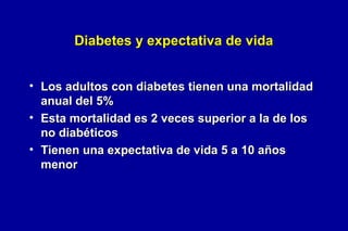 El documento compara la expectativa de vida de personas con diabetes y sin diabetes en diferentes grupos de edad. Las personas con diabetes viven menos años que las personas sin diabetes, con una diferencia de 5 a 27 años dependiendo del grupo de edad. Además, la tasa de mortalidad anual de los adultos con diabetes es del 5%, el doble que la de las personas sin diabetes. La diabetes reduce la expectativa de vida de las personas en 5 a 10 años.