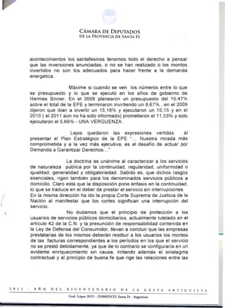 El documento propone que la Empresa Provincial de Energía (EPE) de Santa Fe no cobre el último aumento de tarifas a usuarios que hayan sufrido cortes de más de 24 horas, y les devuelva dicho aumento si ya lo pagaron. También pide indemnizar a industrias y comercios por daños por los cortes. Critica las inversiones insuficientes de la EPE que llevaron a la mala prestación del servicio y los aumentos de tarifas sin mejoras. Solicita aprobar este proyecto de ley.