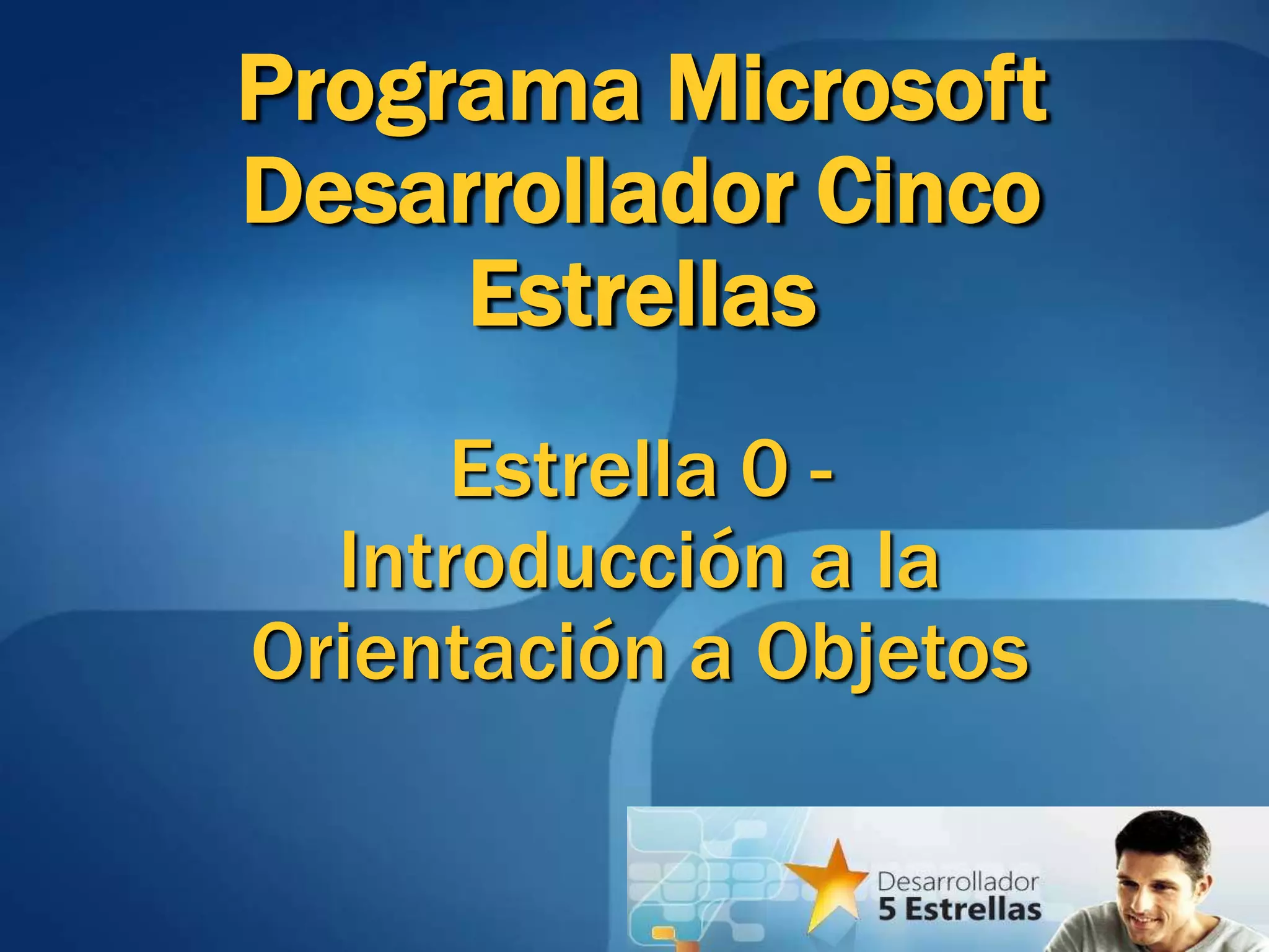 Este documento describe el primer nivel de un programa de cinco estrellas para desarrolladores de Microsoft. Explica conceptos básicos de orientación a objetos como clases, objetos, herencia y encapsulamiento. También cubre temas como UML, interfaces y polimorfismo. El objetivo es proporcionar una introducción al paradigma de orientación a objetos para el desarrollo de software.