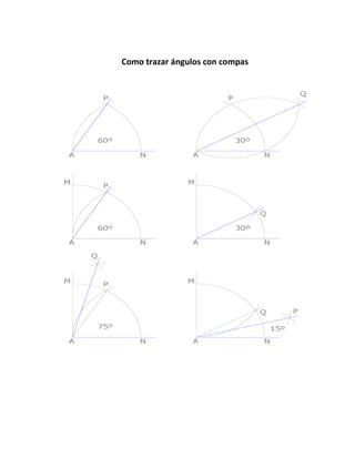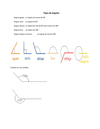 Este documento describe los diferentes tipos de ángulos y cómo trazarlos. Explica que un ángulo agudo es menor que 90°, un ángulo recto es igual a 90°, un ángulo obtuso es mayor que 90° pero menor que 180°, un ángulo llano es igual a 180° y un ángulo reflejo es mayor que 180°. Además, ofrece instrucciones sobre cómo trazar ángulos usando un compás.