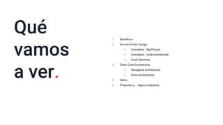 El webinar de junio de 2020 se centra en Domain Driven Design (DDD) y arquitecturas como la hexagonal y la onion, buscando enfocar el diseño de software en la colaboración entre expertos de negocio y técnicos. Se abordan conceptos clave como el lenguaje ubicuo, la separación de dominios mediante bounded contexts, y la importancia de las prácticas de clean code. Además, se presenta una demo de un desarrollo en Python que ilustra la portabilidad del modelo de dominio y su implementación en diferentes arquitecturas.