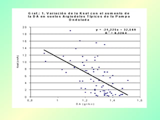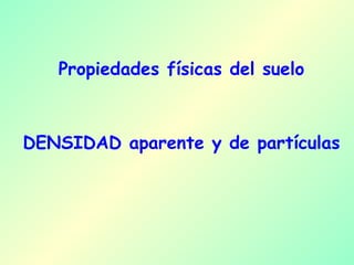 El documento describe las propiedades físicas de densidad aparente y densidad de partículas en los suelos. La densidad aparente incluye el volumen de partículas sólidas y espacios porosos, mientras que la densidad de partículas solo considera el volumen de sólidos. Se explican los usos y valores típicos de estas propiedades en diferentes tipos de suelo.