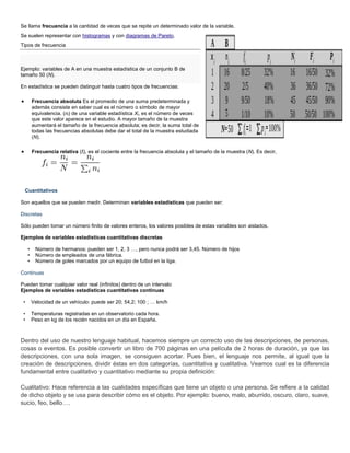 Este documento describe los diferentes tipos de frecuencias en estadística, incluyendo la frecuencia absoluta, que es el número de veces que un valor aparece en un estudio, y la frecuencia relativa, que es la frecuencia absoluta dividida por el tamaño de la muestra. También describe las variables cuantitativas, que pueden ser discretas u continuas, y las cualitativas, que se refieren a las cualidades específicas de un objeto o persona.
