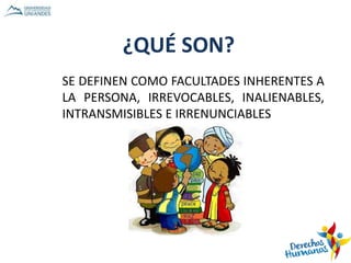 Este documento resume la evolución histórica de los derechos humanos desde el 300 a.C. hasta la actualidad. Explica que los derechos humanos son facultades inherentes a todas las personas e irreversibles. Luego describe hitos clave como la Carta Magna de 1215, la Declaración de Independencia de EE.UU. de 1776 y la Declaración Universal de Derechos Humanos de 1948 aprobada por la ONU. Finalmente, clasifica los derechos humanos en tres generaciones vinculadas a la libertad, igualdad y solidaridad.