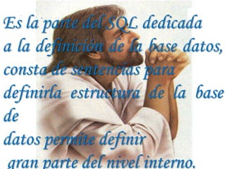 Este documento trata sobre el lenguaje SQL y sus diferentes componentes. Explica que el DDL se utiliza para definir la estructura de la base de datos mediante sentencias como CREATE, DROP, y ALTER. También describe herramientas de programación como SQL Server Management Studio y componentes del lenguaje T-SQL como sentencias DCL, DDL, DML. Por último, explica que SELECT permite obtener resúmenes de datos y que las funciones SQL incluyen funciones de conjunto, agregado, escalares y de categorías como fecha, cadena y seguridad.