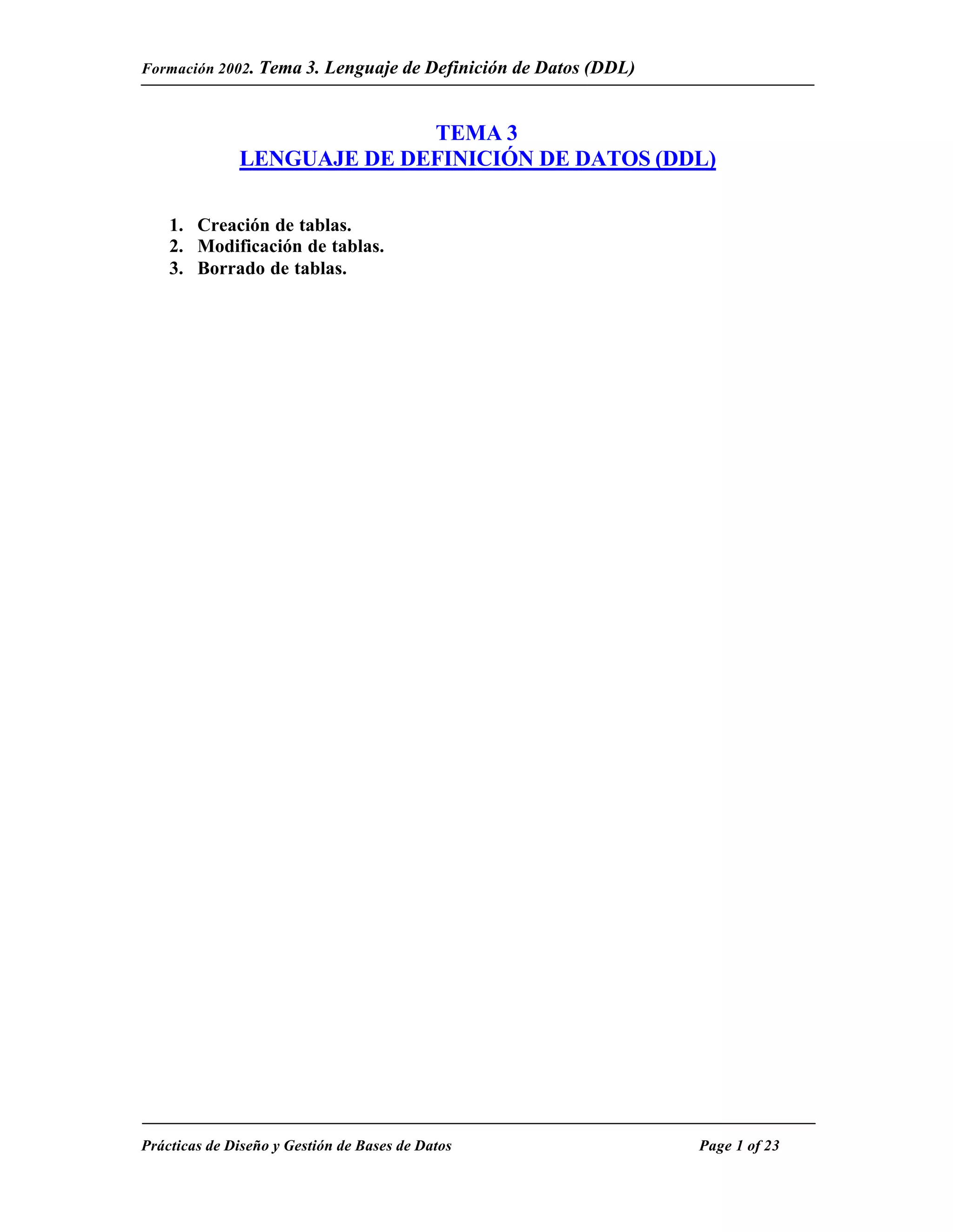 Este documento describe el lenguaje de definición de datos (DDL) en SQL. Explica cómo crear, modificar y eliminar tablas usando los comandos CREATE TABLE, ALTER TABLE y DROP TABLE. Además, proporciona ejemplos de cómo crear tablas específicas para una base de datos de ventas que incluye tablas para clientes, tiendas, proveedores, artículos y ventas.