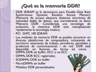 La memoria DDR permite dos operaciones de memoria por ciclo de reloj, proporcionando el doble de rendimiento que la memoria SDRAM. La memoria DDR se encuentra en diversas plataformas y está disponible en varios factores de forma. El modo dual channel permite el acceso simultáneo a dos módulos de memoria para mejorar el rendimiento.