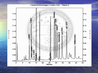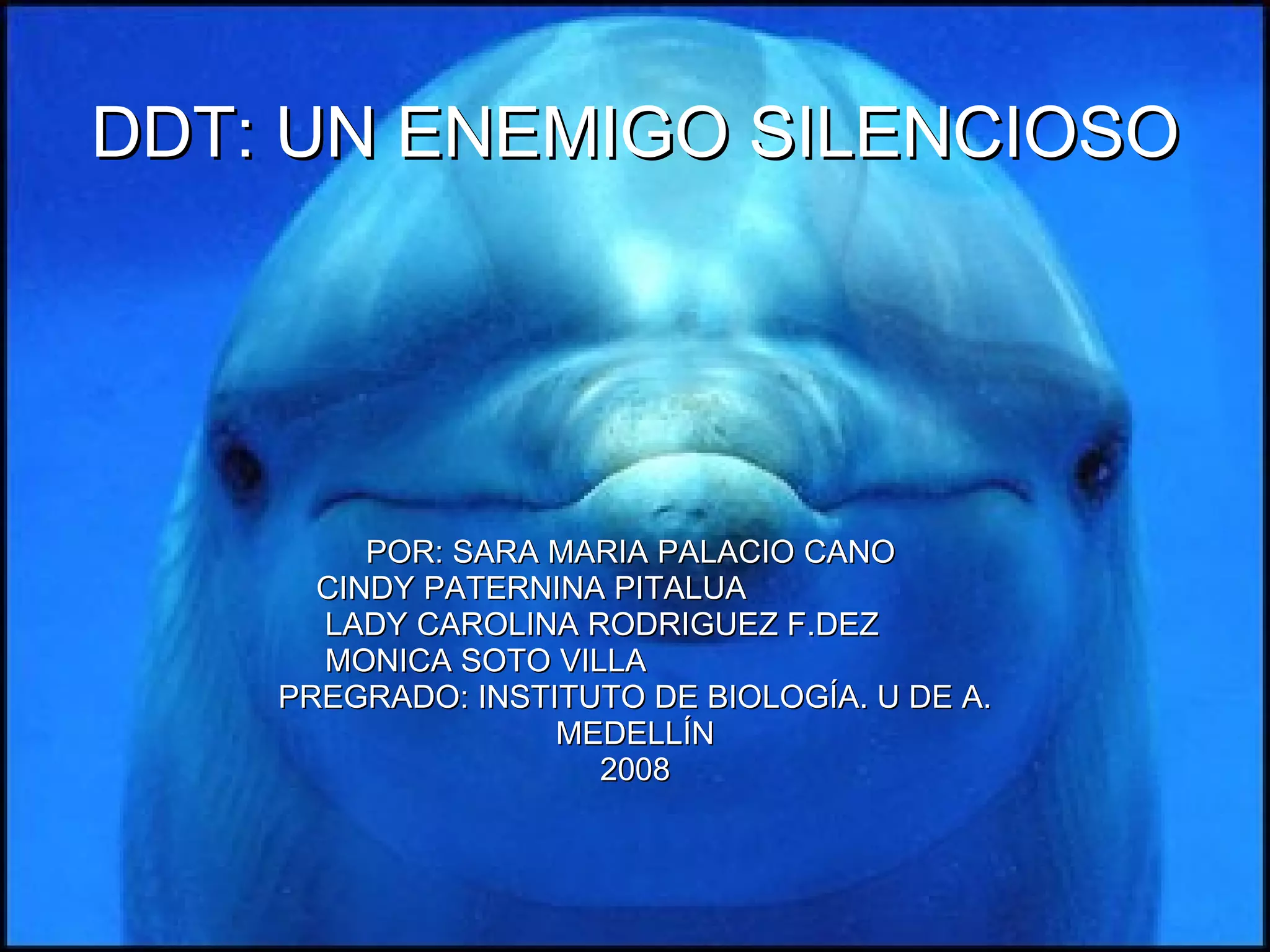 Este documento resume un estudio sobre los niveles de DDT y DDE en poblaciones humanas y animales en el archipiélago canario. El estudio encontró altos niveles de estos contaminantes orgánicos persistentes en delfines mulars debido a sus hábitos alimenticios costeros. También se detectó DDT y DDE en el 99% y 88% de las muestras de suero humano respectivamente, siendo mayores los niveles en mujeres mayores de 20 años de islas con mayor actividad agrícola. Los autores concluy
