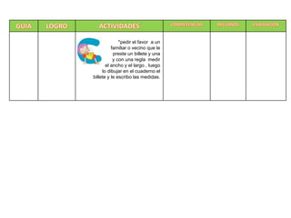 El documento presenta las actividades planeadas para diferentes temas en Matemáticas, Ciencias Naturales, Ciencias Sociales y Lenguaje para el grado segundo de la institución Colegio Cabecera del Llano sede B. Las actividades incluyen leer textos, responder preguntas, realizar observaciones, dibujos y trabajos escritos para reconocer el valor del dinero, identificar ciclos de vida, el clima y paisajes, y explicar el lenguaje no verbal.