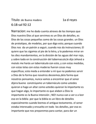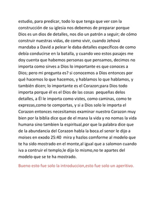 El documento habla sobre la importancia de seguir el modelo que Dios nos ha dado para edificar nuestras vidas. Explica que Dios es detallista y nos da instrucciones específicas, como se ve en la construcción del Tabernáculo. Argumenta que si no seguimos el modelo de Dios al edificar nuestras vidas espirituales, relaciones, y negocios, estamos destinados al fracaso. También enfatiza la necesidad de usar la "madera correcta", refiriéndose a las cualidades del cedro, para preservar nuestra vida de la