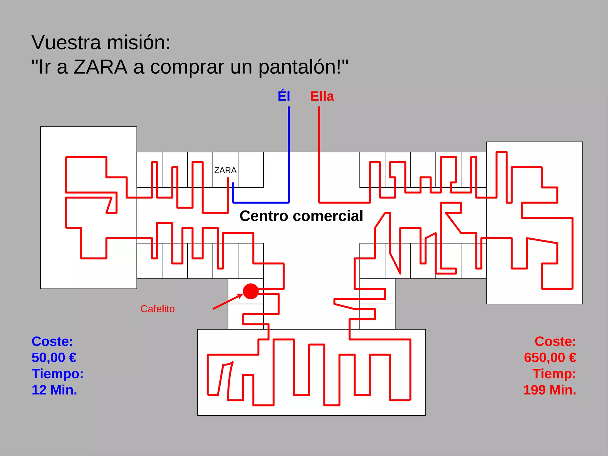 Vuestra misión: "Ira ZARA a comprar un pantalón!" Él Ella Cafelito Coste: 50,00 € Tiempo: 12 Min. Coste: 650,00 € Tiemp: 199 Min. Centro comercial ZARA