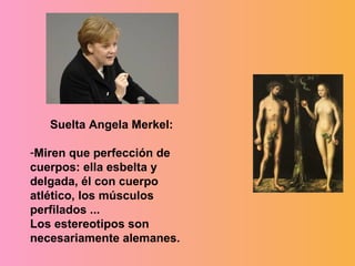 Después de una reunión de la CE, varios ministros visitaron el Museo del Louvre y contemplaron un cuadro de Adán y Eva en el Paraíso, discutiendo sobre la nacionalidad de las figuras representadas basándose en sus características físicas y comportamiento: Angela Merkel sugiere que son alemanes, Sarkozy dice que son franceses, Gordon Brown opina que son ingleses, y Zapatero concluye que son españoles.