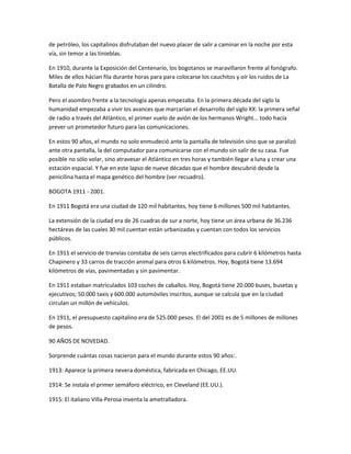 El documento describe cómo era Colombia y Bogotá en 1911 comparado con el presente. En 1911 Colombia tenía 4 millones de habitantes y el café representaba el 46% de las exportaciones. Bogotá tenía 120,000 habitantes, 36 iglesias, y transporte de mulas y caballos. Desde entonces, el país y la ciudad han experimentado un rápido desarrollo tecnológico y de comunicaciones, incluyendo el ferrocarril, automóviles, aviones, radio, televisión e Internet.