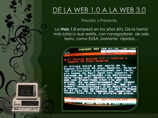 La Web 1.0 comenzó en la década de 1960 con navegadores de solo texto y permitió sitios web estáticos. La Web 2.0 surgió en 2004 y permitió la colaboración entre usuarios a través de blogs, wikis y redes sociales. La Web 3.0 se refiere a la evolución continua de la web hacia el uso de inteligencia artificial y datos semánticos para hacer que los contenidos sean más accesibles entre múltiples aplicaciones.