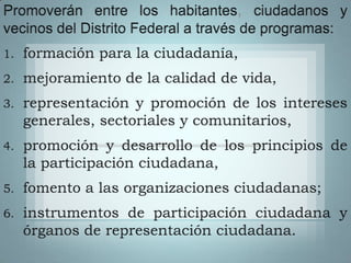 El documento describe los instrumentos de participación ciudadana en el distrito federal, como el plebiscito, referéndum e iniciativa popular, regulando sus condiciones y limitaciones. También menciona la consulta ciudadana, la rendición de cuentas y la colaboración ciudadana para mejorar la gestión pública, así como las asambleas ciudadanas que permiten la participación directa de los habitantes. Además, se establece la red de contralorías ciudadanas para supervisar la transparencia y eficiencia del gasto público.