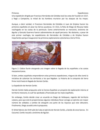 El documento resume las primeras expediciones españolas a México desde 1511 hasta la conquista de Tenochtitlán en 1521. Menciona la llegada accidental de los primeros españoles a Yucatán en 1511 y sus interacciones con los mayas. Luego describe las expediciones de Hernández de Córdoba en 1517, Juan de Grijalva en 1518 y la llegada de Hernán Cortés en 1519, quien se alió con pueblos nativos como los totonacos y tlaxcaltecas. Relata la llegada de Cortés a Tenochtitlán