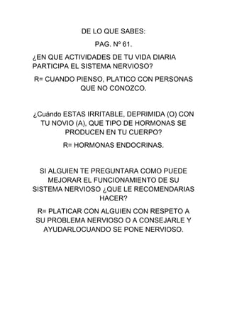 El documento habla sobre cómo el sistema nervioso participa en actividades diarias como el pensamiento y la conversación, y cómo las hormonas endocrinas se producen cuando se está irritable, deprimido o con la pareja. Recomienda platicar respetuosamente con alguien sobre problemas nerviosos o ayudarlo cuando se pone nervioso para mejorar el funcionamiento del sistema nervioso.