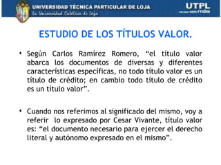 Este documento habla sobre los títulos de valor, en particular las letras de cambio. Explica que los títulos de valor son documentos que incorporan derechos y obligaciones económicas y pueden circular. Describe las características de los títulos de valor como ser necesarios, legítimos, literales y patrimoniales. También explica el contenido requerido de una letra de cambio, el proceso de endoso y la función del aval o garantía en una letra de cambio.
