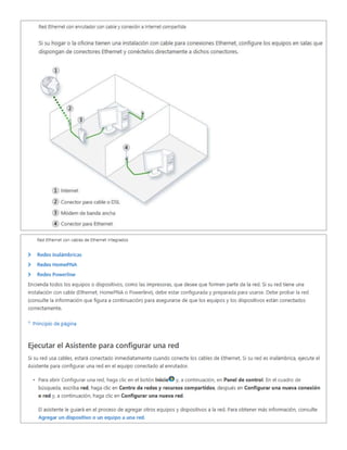 El documento describe los 6 pasos para configurar una red doméstica en Windows 7: 1) planear la red, 2) obtener hardware y un proveedor de internet, 3) configurar el enrutador, 4) conectar el enrutador a internet, 5) conectar equipos a la red, y 6) compartir archivos e impresoras. Proporciona detalles sobre cada paso, incluyendo cómo configurar manualmente o automáticamente un enrutador y conectarlo a internet y otros equipos.