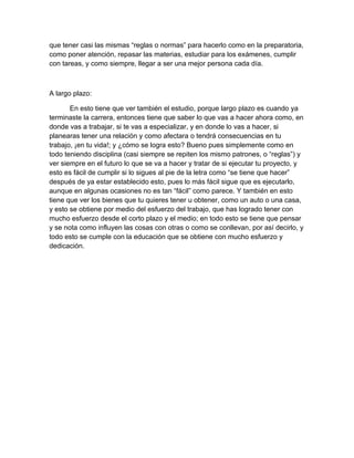 El documento describe los objetivos a corto, medio y largo plazo del autor para su proyecto escolar y de vida. A corto plazo, el autor busca mejorar su rendimiento académico mediante una mayor atención y puntualidad. A medio plazo, el autor planea terminar su carrera universitaria de medicina a través del estudio constante. A largo plazo, el autor espera trabajar en su campo, posiblemente especializarse, y obtener bienes materiales gracias a su esfuerzo y educación.