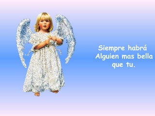 Este documento ofrece palabras de ánimo para las mujeres, enfatizando que siempre habrá alguien más bella, inteligente o con más posesiones materiales. Sin embargo, esas personas también pueden tener tristezas o problemas en su vida. Por lo tanto, las mujeres deben amarse a sí mismas tal como son y aceptar sus circunstancias en lugar de compararse con los demás. El documento concluye animando a las mujeres a ser felices y bendecidas.