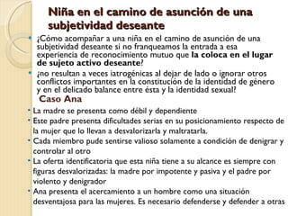 El documento analiza la constitución de la subjetividad femenina y los factores de riesgo en su desarrollo psíquico como el funcionamiento deficitario del deseo hostil en las niñas y sus dificultades en el juicio crítico basadas en los apegos con la madre. También explora cómo acompañar a las niñas en la asunción de una subjetividad deseante a través del reconocimiento mutuo y la necesidad de articular a la madre como sujeto sexual.
