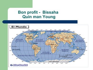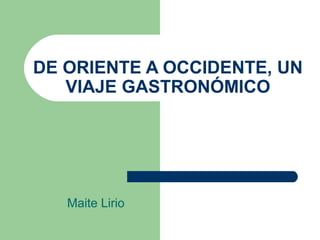 Este documento describe aspectos de la cocina marroquí y china. La cocina marroquí se ve influenciada por las culturas bereber, árabe, andalusí y europea, destacando platos como el cuscús y el tajine. La cocina china se basa en la armonía de sabores y diferentes escuelas regionales, utilizando métodos de cocción como el salteado o al vapor. Ambas cocinas comparten el uso de especias e ingredientes característicos.