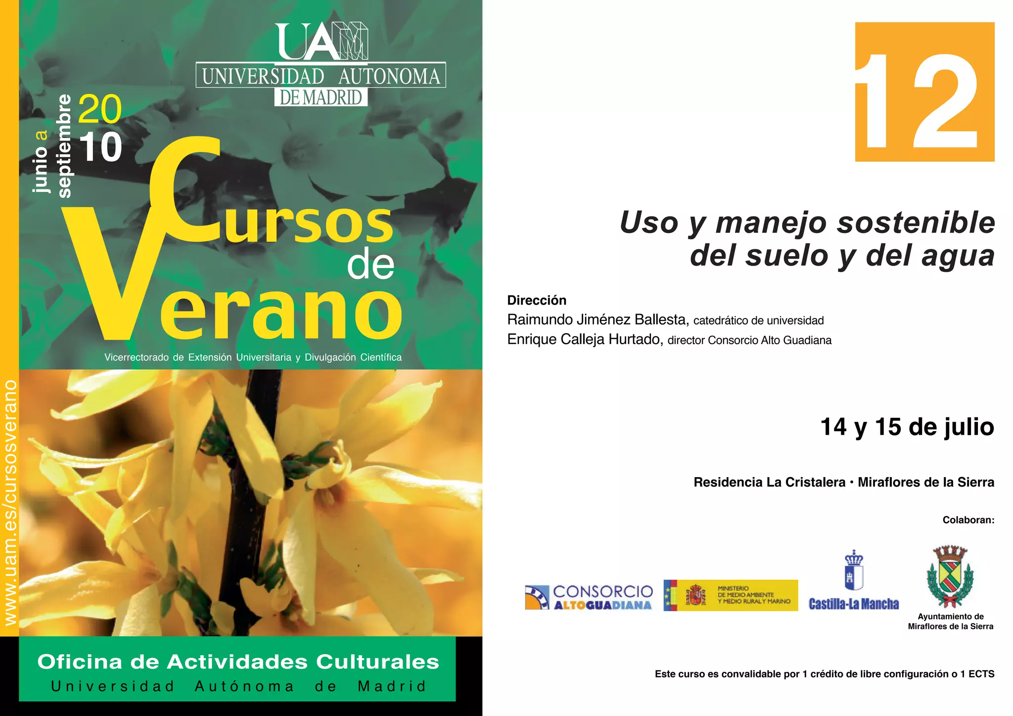Este documento presenta el programa de un curso sobre el uso y manejo sostenible del suelo y el agua que se llevará a cabo los días 14 y 15 de julio. El curso abordará temas como la calidad del suelo, los procesos de degradación, el uso histórico del agua en La Mancha, los modelos hidrogeológicos, el uso eficiente del agua en cultivos, la degradación y conservación de suelos, y las implicaciones del nuevo ciclo del agua en los humedales. El curso está dirig