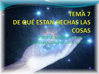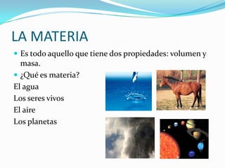 Este documento trata sobre las propiedades y estados de la materia. Explica que la materia tiene volumen y masa, y existen en tres estados: sólido, líquido y gaseoso. Los estados sólido y líquido mantienen su forma, mientras que el estado gaseoso tiende a expandirse. La materia también puede mezclarse y experimentar cambios físicos o químicos como la combustión. Finalmente, distingue entre materiales naturales y artificiales.