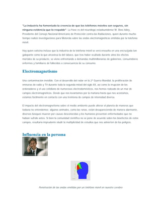 La contaminación electromagnética comenzó en 1882 con la instalación de las primeras redes eléctricas y ha ido aumentando con el desarrollo de tecnologías como la radio, televisión, radar, telefonía móvil y redes inalámbricas. Estos campos electromagnéticos pueden afectar la salud humana, alterando el ADN y afectando glándulas como la pineal, relacionada con el cáncer. Es recomendable limitar el uso de dispositivos móviles, especialmente entre los jóven