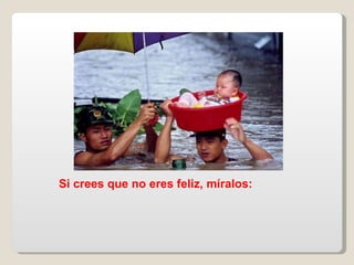 Este documento presenta varias imágenes y preguntas retóricas con el objetivo de promover la gratitud y la empatía. Resalta que a pesar de las quejas y problemas personales, muchos tienen más de lo necesario y hay quienes enfrentan mayores dificultades como pobreza, enfermedad y soledad. Insta a quejarse menos, ayudar a los demás y apreciar lo que se tiene en lugar de centrarse en lo material.