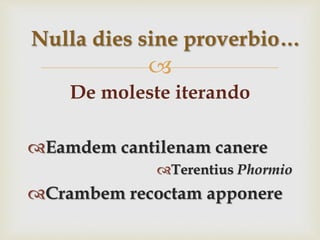 El documento contiene varias secciones breves sobre temas como cantar la misma canción repetidamente, llevar leña al bosque, y una carta de Erasmo sobre una pelea doméstica. También incluye secciones sobre comentar y analizar textos antiguos usando la razón y estilo de Sallustio.