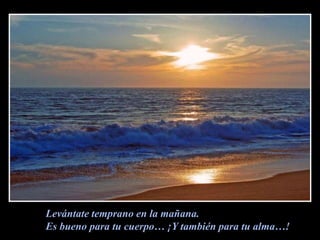 Este documento ofrece consejos breves sobre cómo llevar una vida sencilla y plena. Recomienda levantarse temprano, orar diariamente, cuidar un jardín, agradecer siempre, practicar un hobby, vestir ropa natural, abrazar a los seres queridos, sonreír, tener fe en Dios, escuchar en silencio, perdonar ofensas, observar a los niños, pedir ayuda cuando se necesite, y dejar que Jesús sea el mejor amigo.