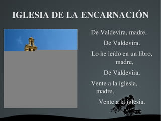 El poema describe la iglesia de la Encarnación en el pueblo de Valdevira, donde la madre se casó. El poema invita a la madre a visitar la iglesia, que tiene una rica portada y columnas, y contiene mucha historia y tradición para el pueblo.