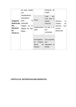 Este documento define variables relacionadas al tránsito vehicular en un distrito de Trujillo, Perú. Define términos como calles, avenidas, pasajes y jirones que son diferentes tipos de vías. También define vehículos, pistas y equipamientos viales. Finalmente, menciona que la Municipalidad de Tarapoto-Banda de Shilcayo es la autoridad que representa al distrito.