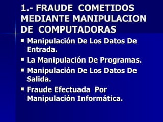 Las Naciones Unidas reconocen cuatro delitos informáticos principales: 1) fraude cometido mediante la manipulación de computadoras, 2) falsificaciones informáticas como objetos o instrumentos, 3) daños o modificaciones de programas o datos computarizados como sabotaje informático mediante virus, gusanos o bombas lógicas, y 4) falsificaciones informáticas como acceso no autorizado a sistemas, piratería informática o reproducción no autorizada de programas.