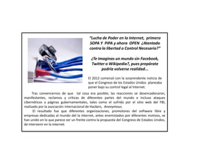 El documento discute las leyes propuestas en varios países para regular el contenido en Internet, como SOPA y PIPA en EE.UU. y leyes similares en España, Francia y el Reino Unido. Mientras que los gobiernos argumentan que estas leyes defienden los derechos de autor, muchos creen que son un atentado contra la libertad en Internet y podrían llevar al cierre de sitios populares como Facebook, Twitter y Wikipedia. La lucha sobre el control de Internet continúa sin resolverse.