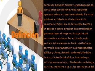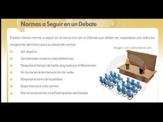 El documento define el debate como una discusión formal y organizada entre dos posiciones opuestas sobre un tema. Cada posición debe exponer su tesis con argumentos y contraargumentos claros para el público. Un moderador dirige el debate para mantener el respeto y objetividad, mientras un secretario toma notas para resumir al final.